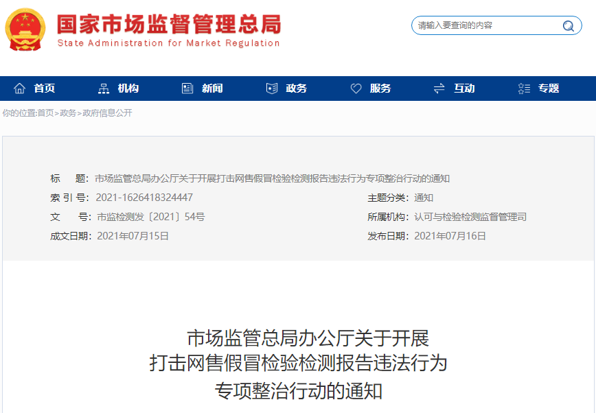 市場監管總局辦公廳關于開展打擊網售假冒檢驗檢測報告違法行為專項整治行動的通知