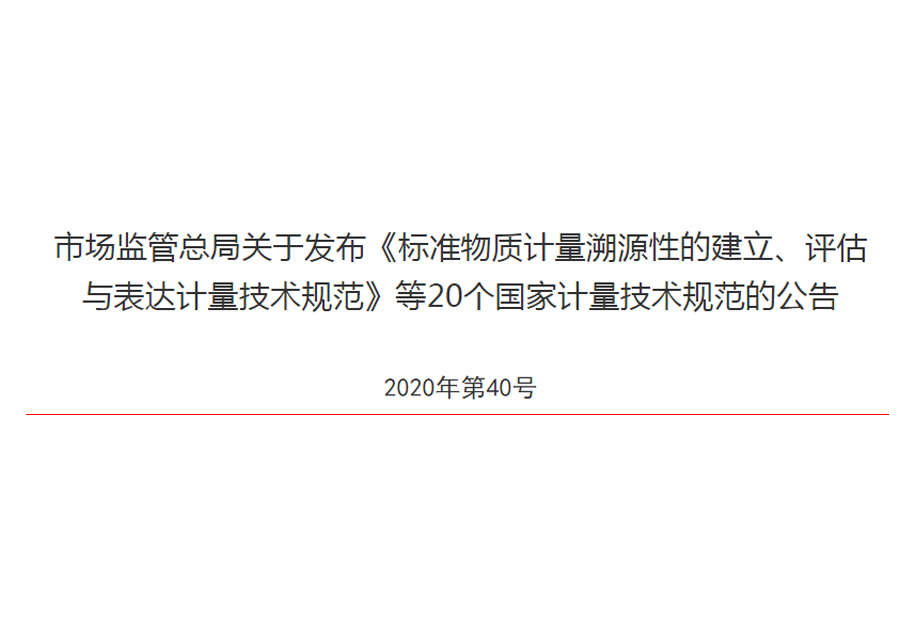 ?2020年9月24日,市場監管總局發布了一則公告,表明根據《中華人民共和國計量法》有關規定,正式發布《標準物質計量溯源性的建立、評估與表達計量技術規范》等20個國家計量技術規范。