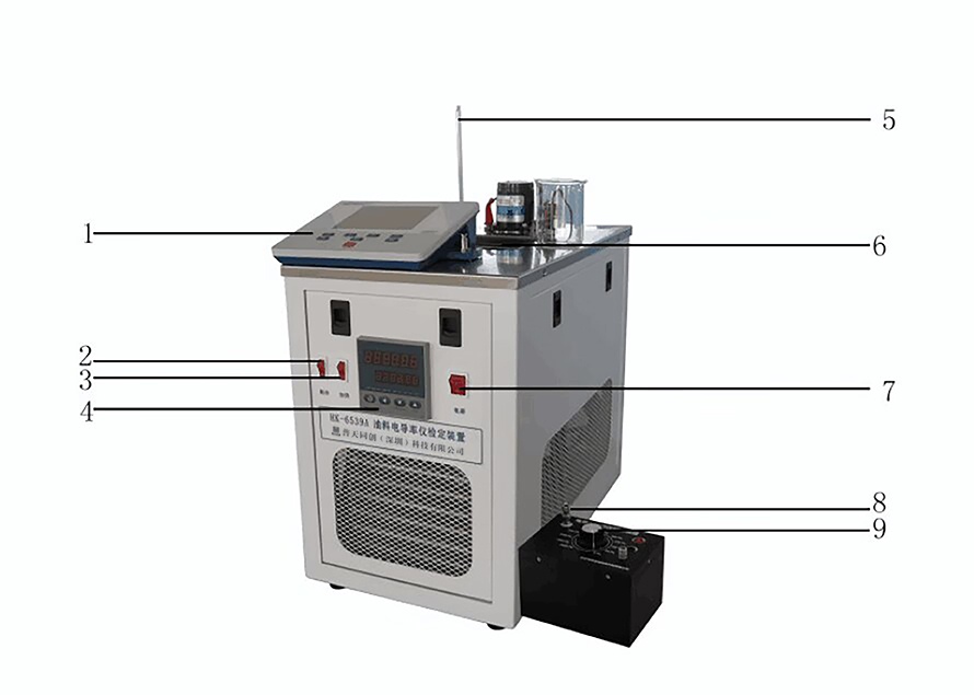 1.電導率儀  2.制冷開關  3.加熱開關  4.溫度控制器  5.校準溫度計  6.燒杯  7.電源開關  8.TNC接口  9.電導率測定儀標準裝置