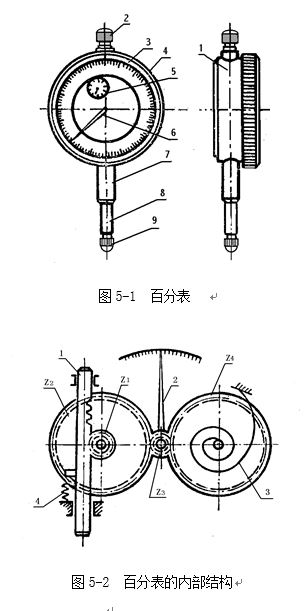 圖5-2是百分表內部機構的示意圖。帶有齒條的測量桿1的直線移動,通過齒輪傳動(Z1 、Z2 、 Z3),轉變為指針2的回轉運動。齒輪Z4和彈簧3使齒輪傳動的間隙始終在一個方向,起著穩定指針位置的作用。彈簧4是控制百分表的測量壓力的。百分表內的齒輪傳動機構,使測量桿直線移動1mm時,指針正好回轉一圈。