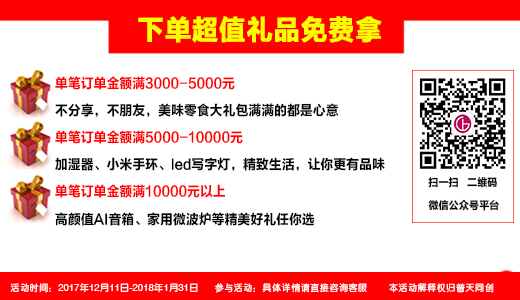 2017年12月11日—2018年1月31日“預存貨款送豪華大禮,活動期間下單更有超值禮品免費拿”雙雙有豪禮!