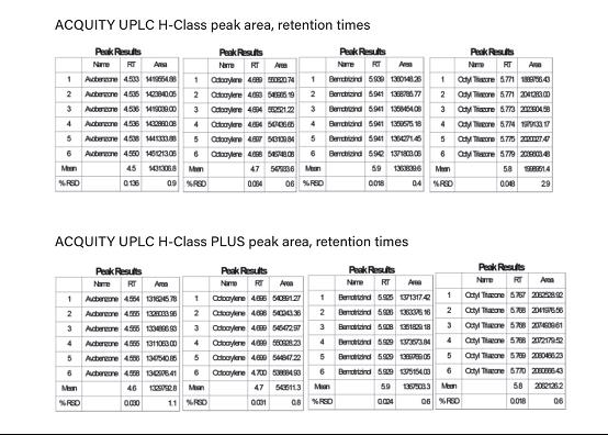 圖3. ACQUITY UPLC H-Class和ACQUITY UPLC H-Class PLUS系統(tǒng)的代表性保留時(shí)間和峰面積數(shù)據(jù)。