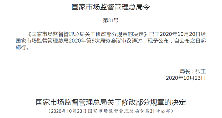 為了全面落實黨的十九屆三中全會審議通過的《中共中央關于深化黨和國家機構改革的決定》《深化黨和國家機構改革方案》和十三屆全國人大一次會議批準的《國務院機構改革方案》,確保行政機關依法履行職責,進一步推進簡政放權、放管結合、優(yōu)化服務改革,市場監(jiān)管總局決定對30件部門規(guī)章的部分條款予以修改。
