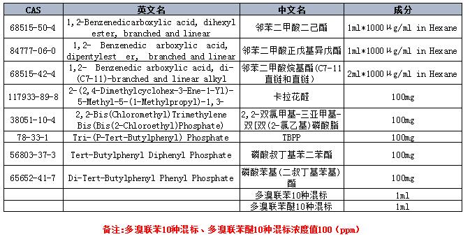 好消息!獨家經營產品鄰苯二甲酸類、磷酸類、多溴聯苯混標類等標準物質入庫啦,歡迎選購,價格優惠,全部現貨供應,可當天發貨。