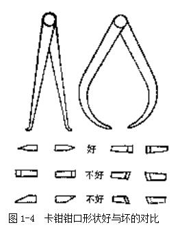 首先檢查鉗口的形狀,鉗口形狀對測量精確性影響很大,應注意經(jīng)常修整鉗口的形狀,圖1-4所示為卡鉗鉗口形狀好與壞的對比。