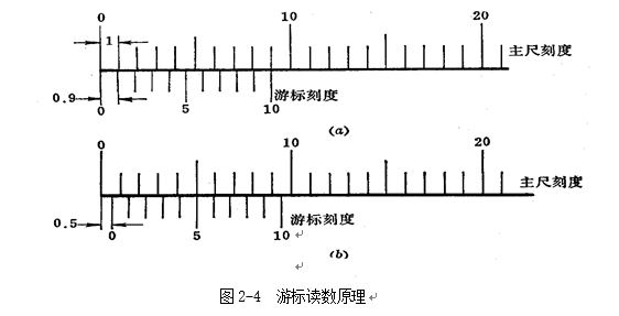 如圖2―4(a)所示,主尺刻線間距(每格)為1mm,當游標零線與主尺零線對準(兩爪合并)時,游標上的第10刻線正好指向等于主尺上的9mm,而游標上的其他刻線都不會與主尺上任何一條刻線對準。