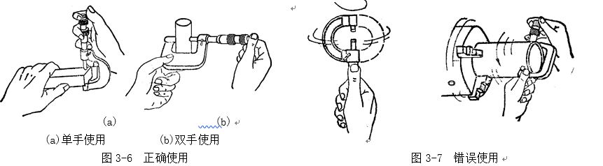 值得提出的是幾種使用外徑百分尺的錯誤方法,比如用百分尺測量旋轉運動中的工件,很容易使百分尺磨損,而且測量也不準確;又如貪圖快一點得出讀數,握著微分筒來揮轉(圖3-7) 等,這同碰撞那樣,也會破壞百分尺的內部結構。